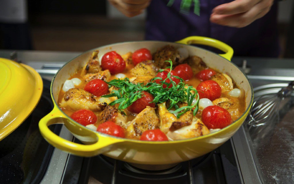 - Reduce the heat to medium and add the shallots and pearl onions to the pan. Cook, stirring, until the shallots are soft. Add the tomato paste and flour and cook, stirring, for another minute. Add the vinegar, bring to a simmer, then stir in the chicken stock. Bring to a simmer, making sure to scrape the bottom of the pan. Return the chicken to the pan with half of the tomatoes and the tarragon. Cover and simmer for 10 minutes, stirring occasionally. Add the remaining tomatoes, cover, and simmer for another 20 minutes, or until the chicken is cooked through.