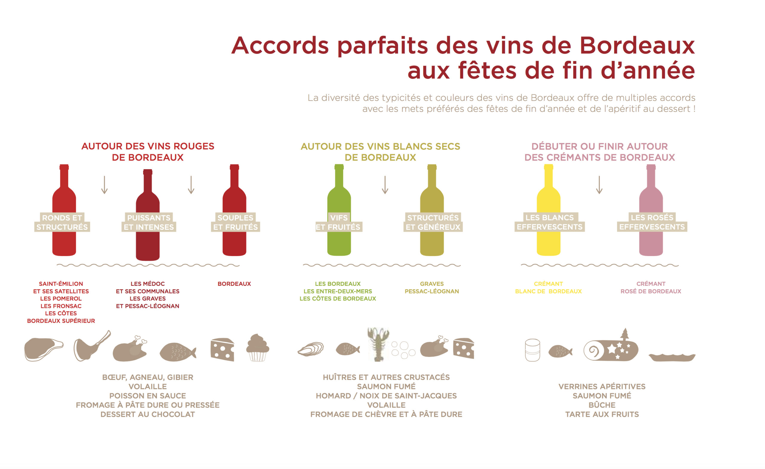 A l’approche de fêtes, on a choisi de vous donner quelques astuces pour les accords mets et vins de Bordeaux tout en vous rappelant que le goût est une affaire personnelle. Petit rappel sur les alliances mets et vins de Bordeaux en images !